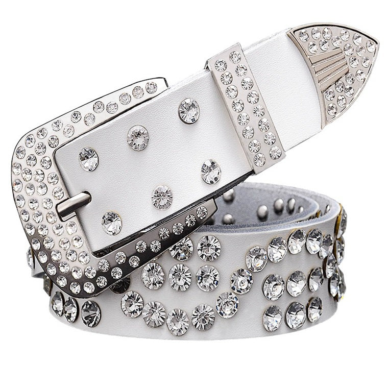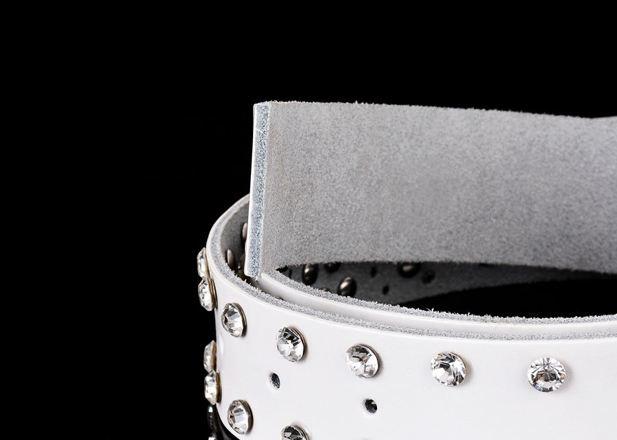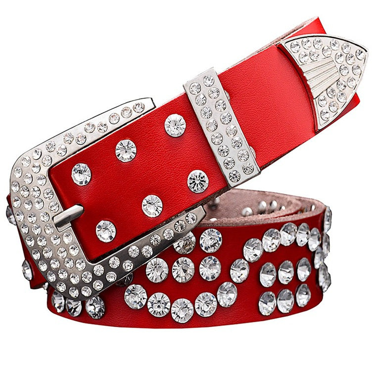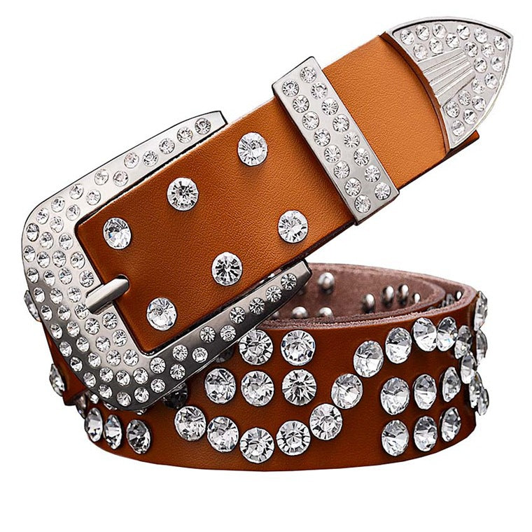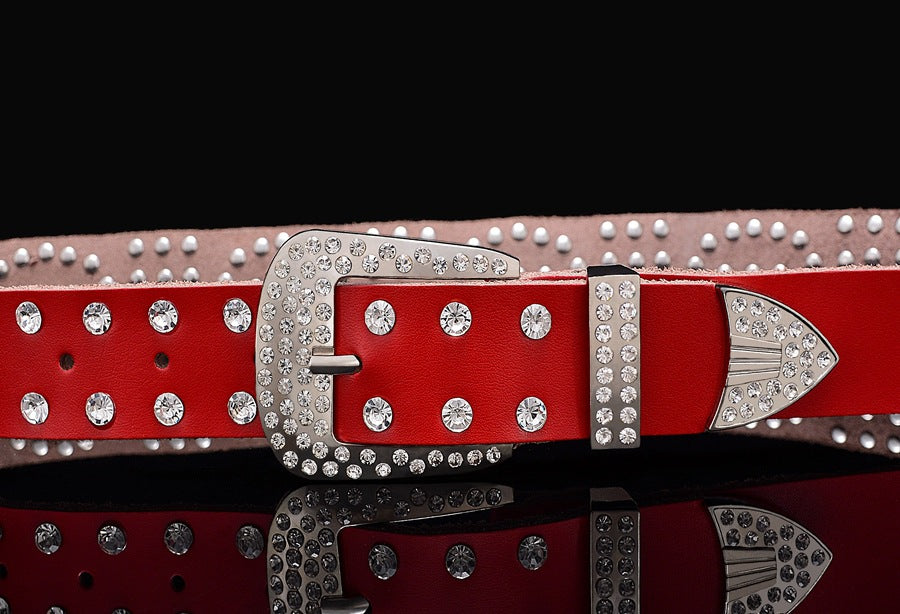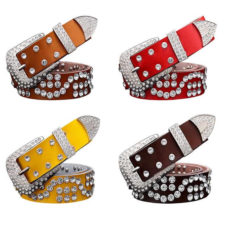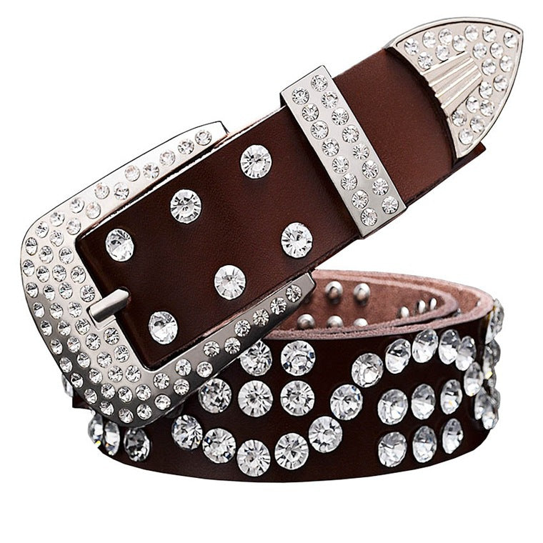 Leather Ladies Belt With Diamond-Studded Cowhide Pin Buckle