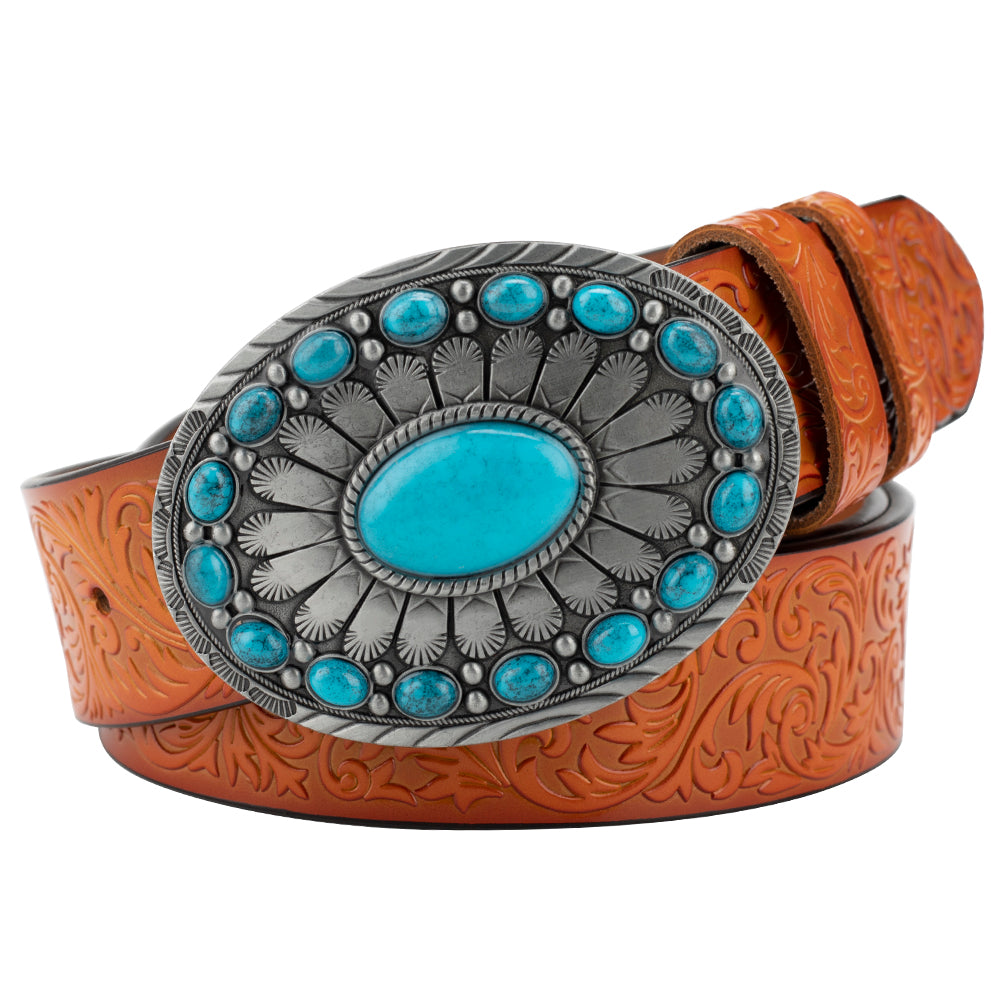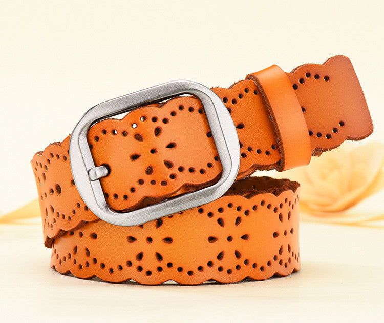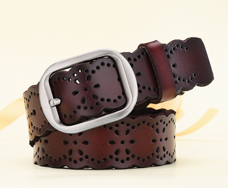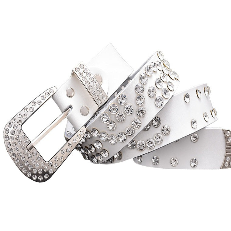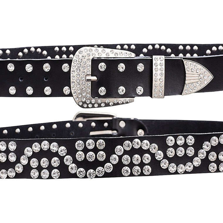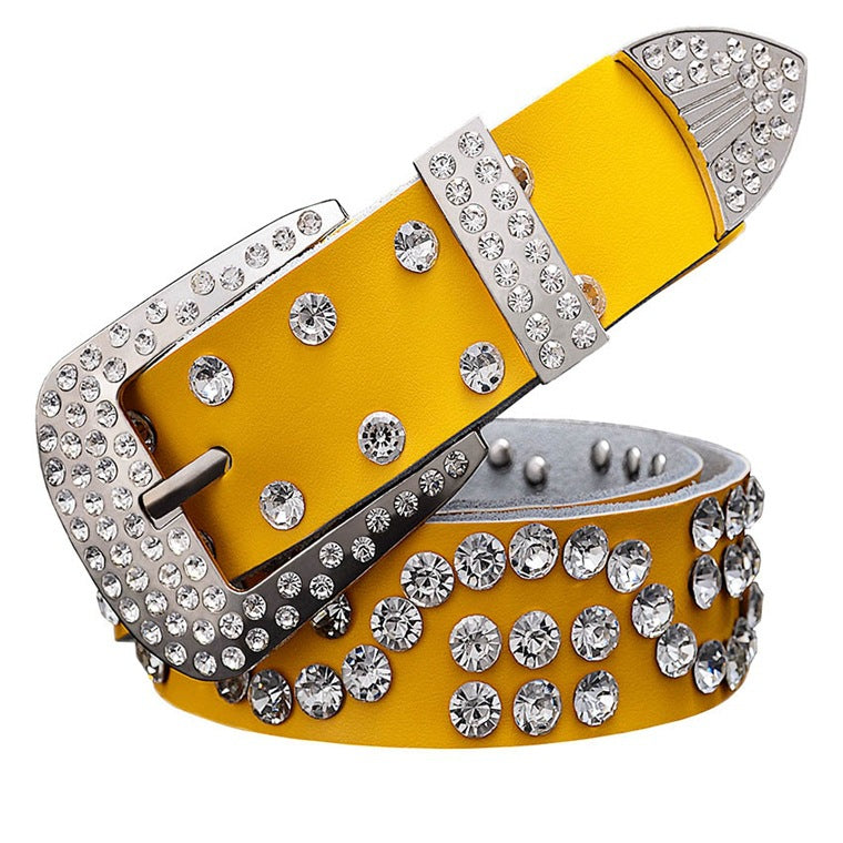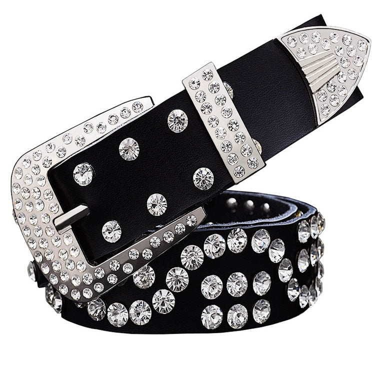 Leather Ladies Belt With Diamond-Studded Cowhide Pin Buckle