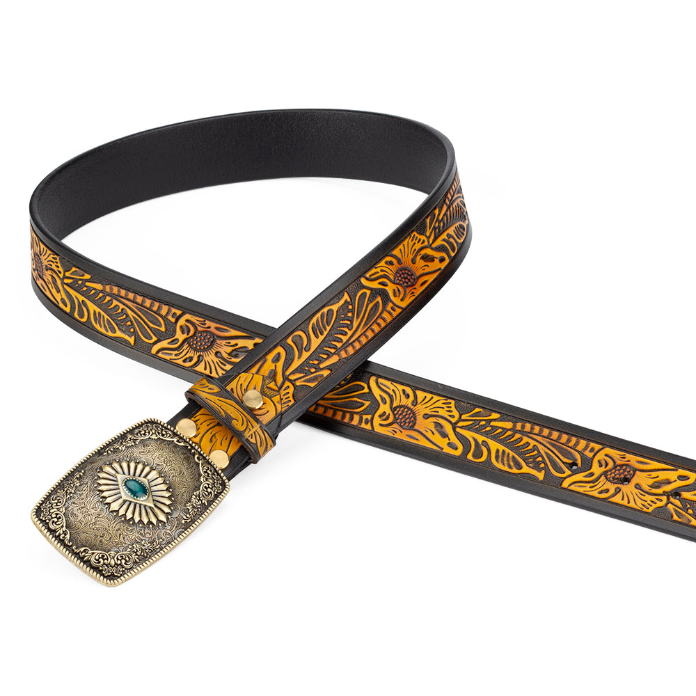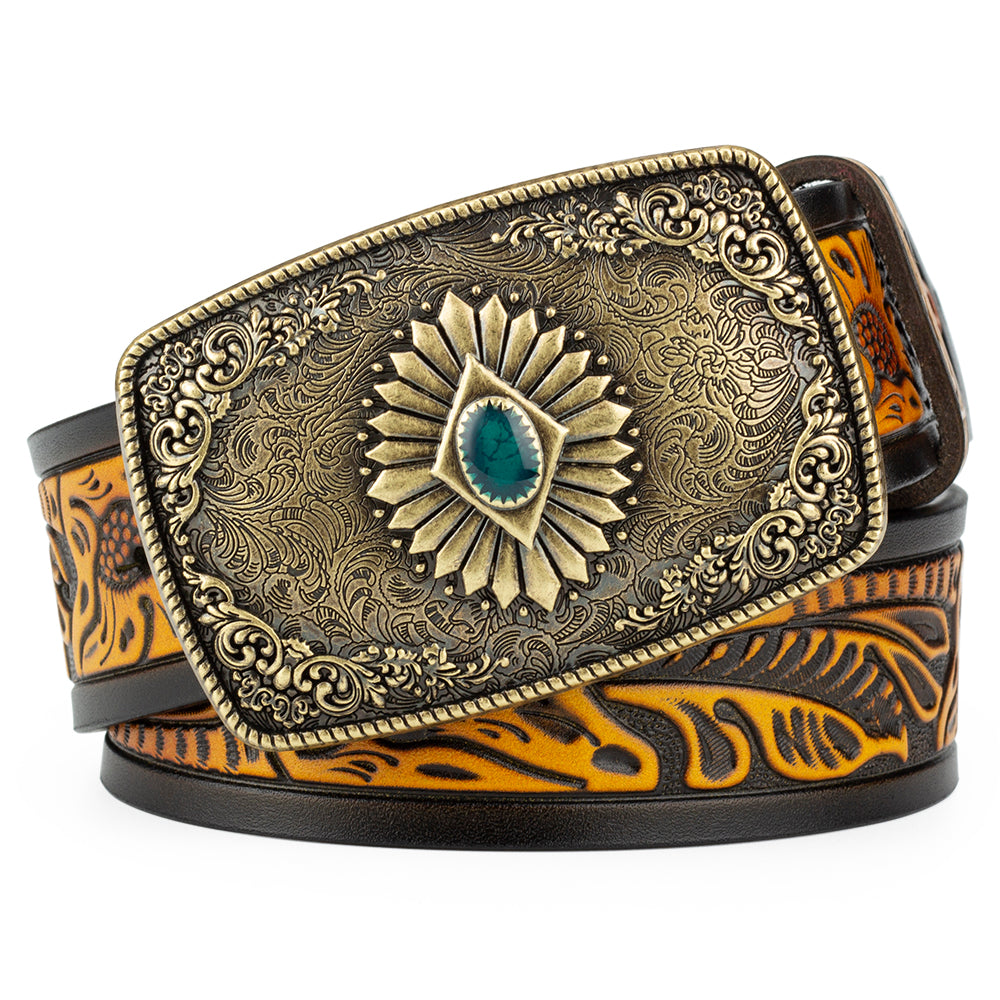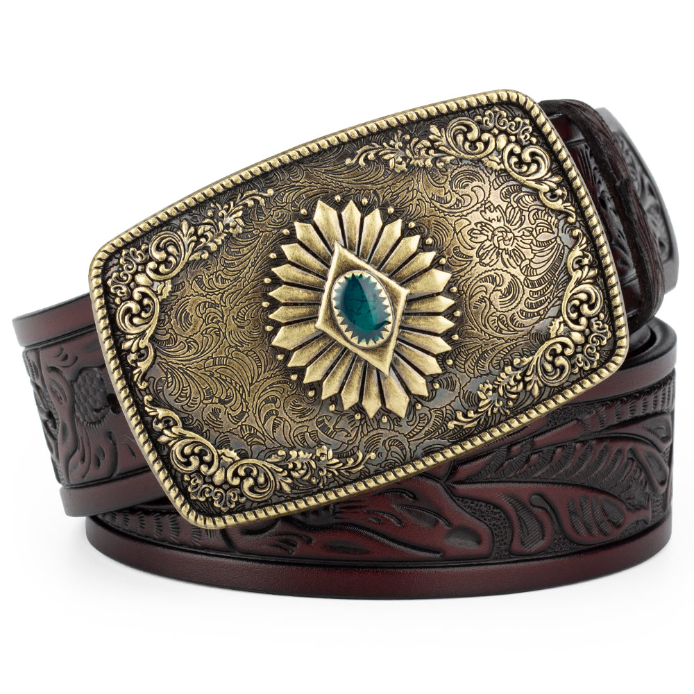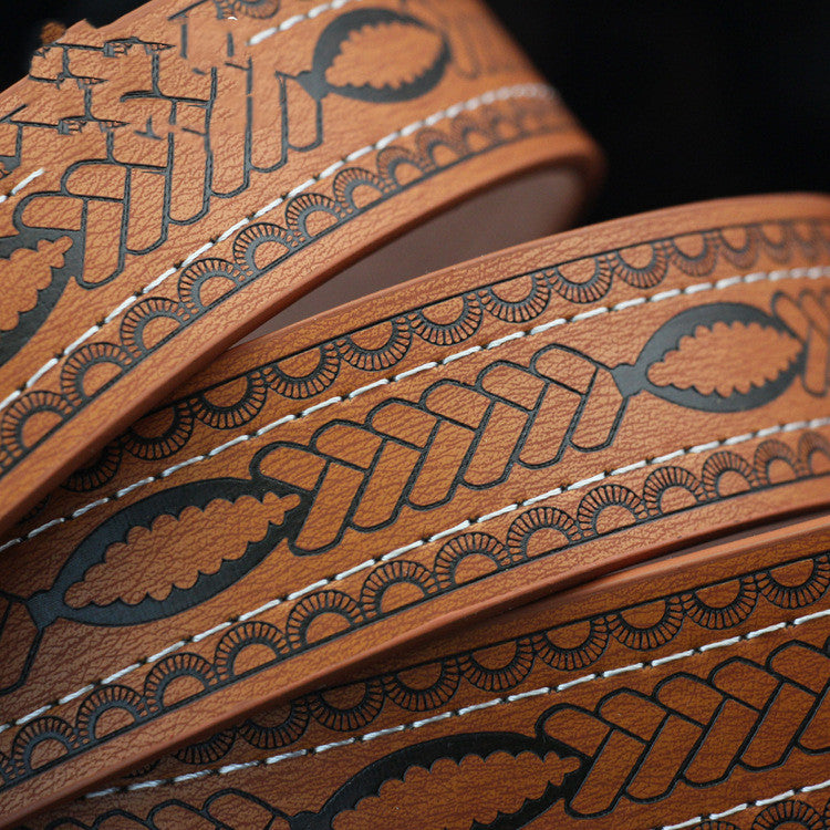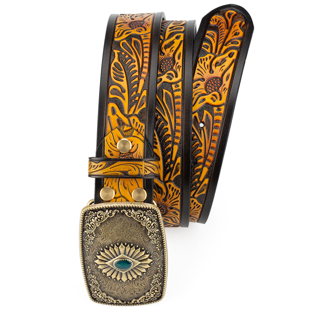 Bronze Pattern Buttoned Tang Grass Embossed Leather Belt