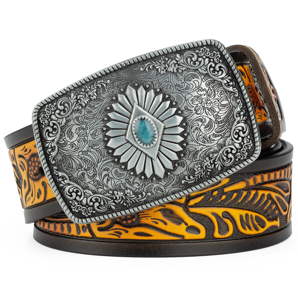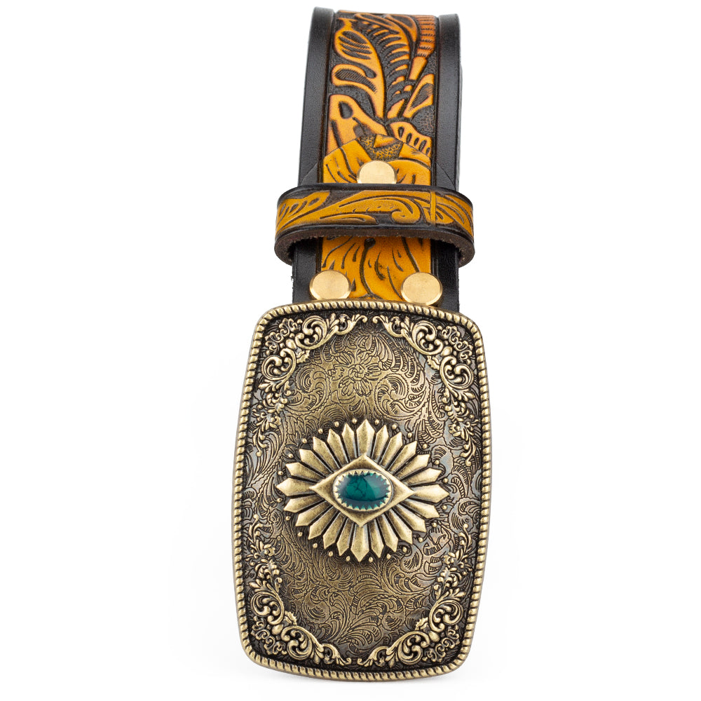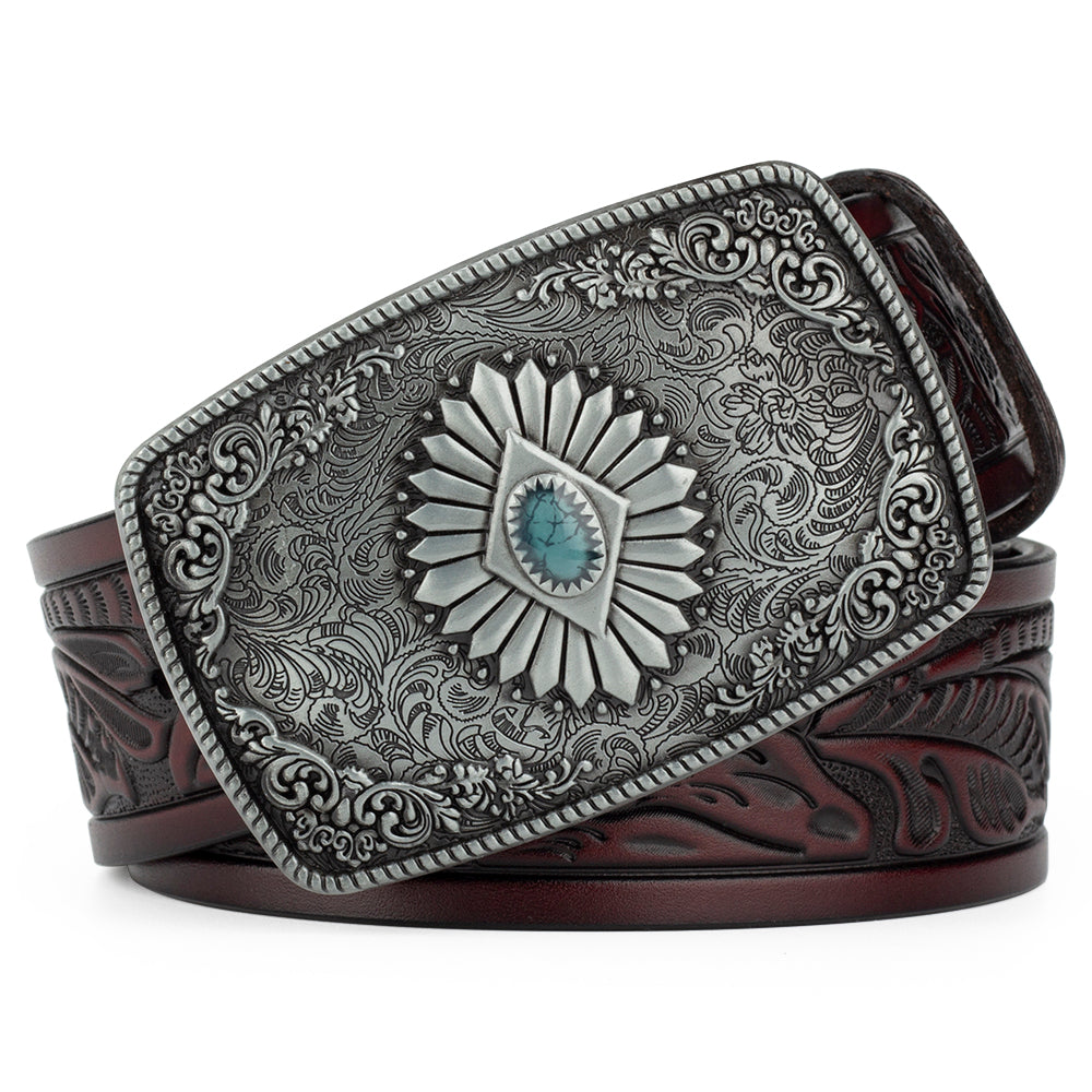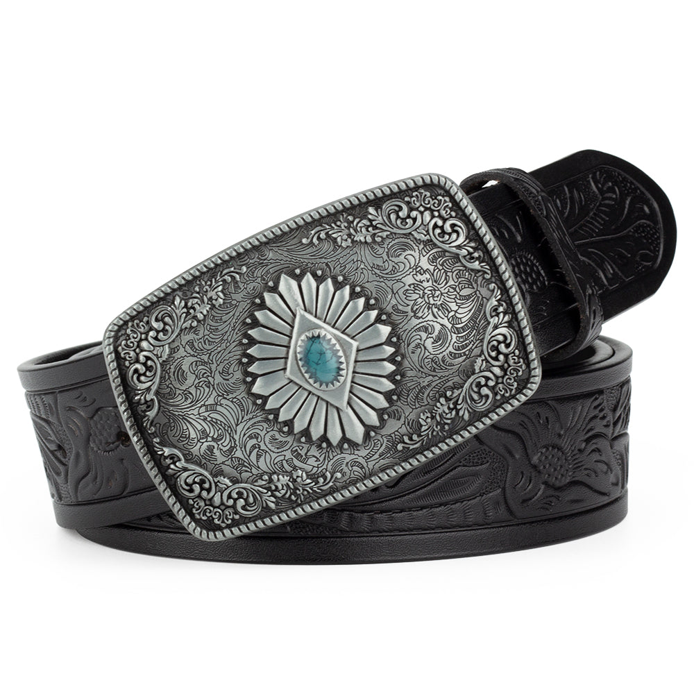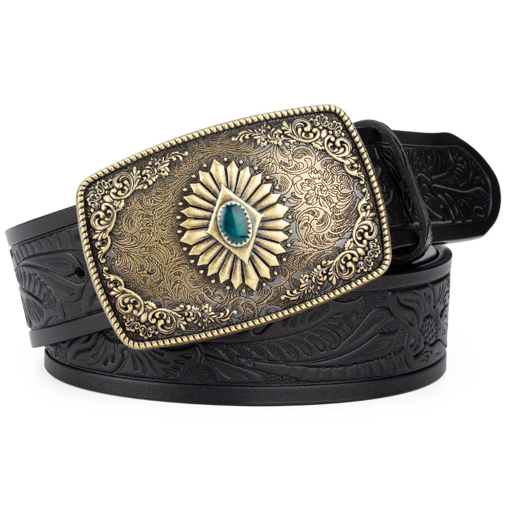 Bronze Pattern Buttoned Tang Grass Embossed Leather Belt