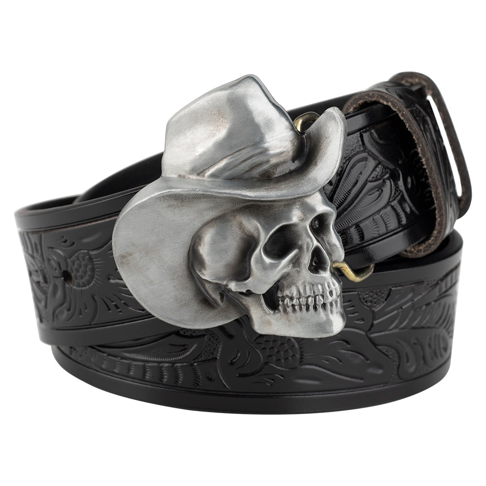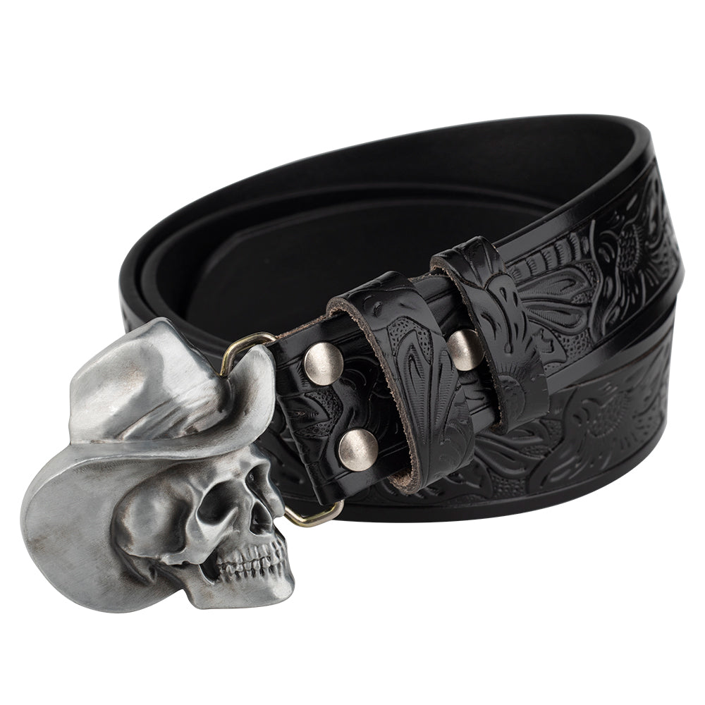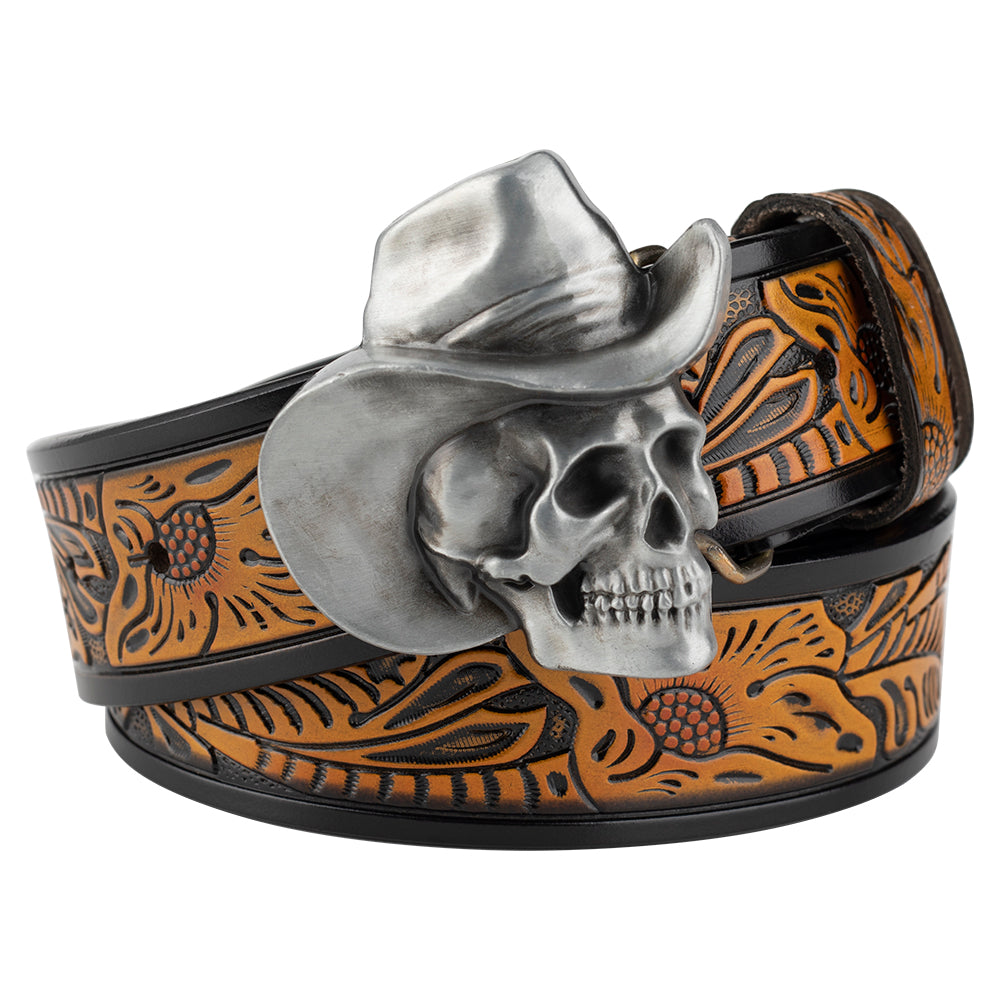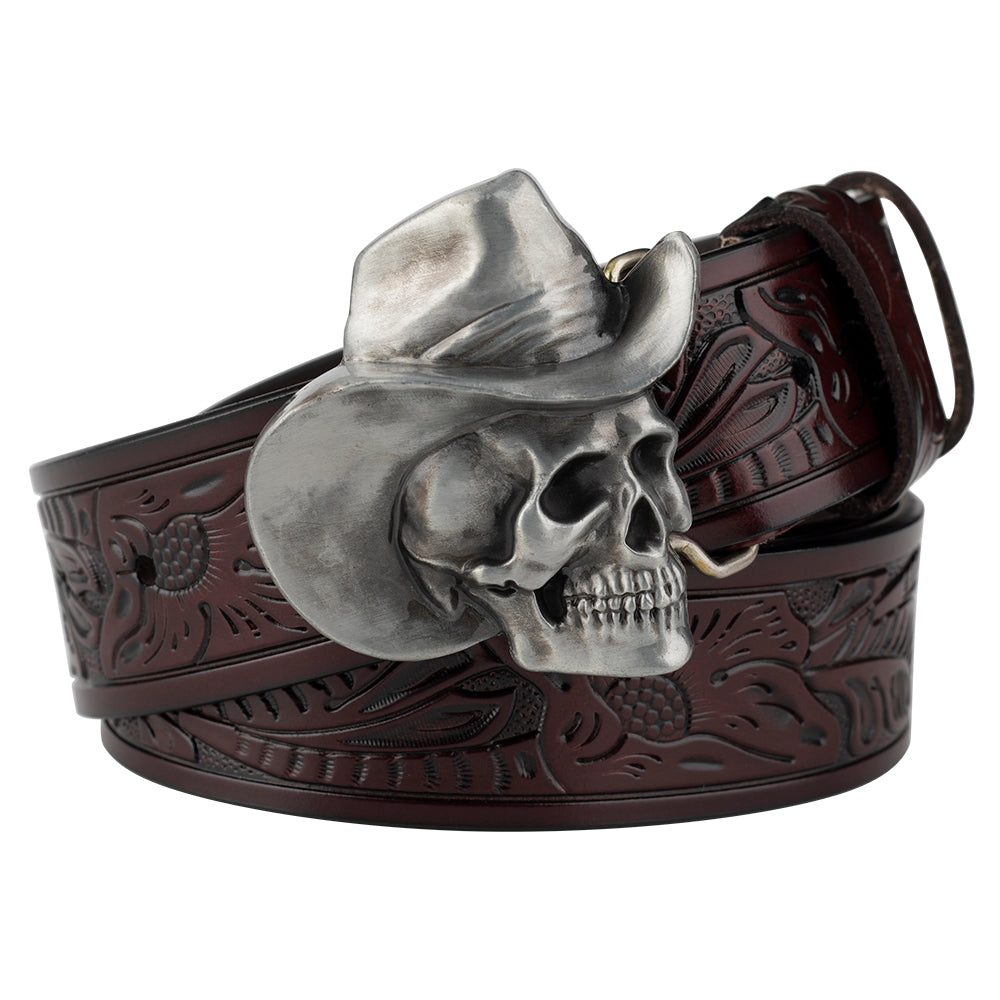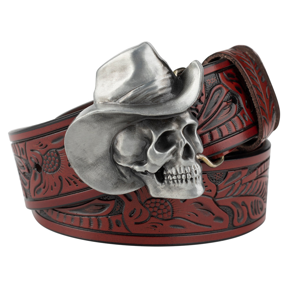 Bronze Pattern Buttoned Tang Grass Embossed Leather Belt
