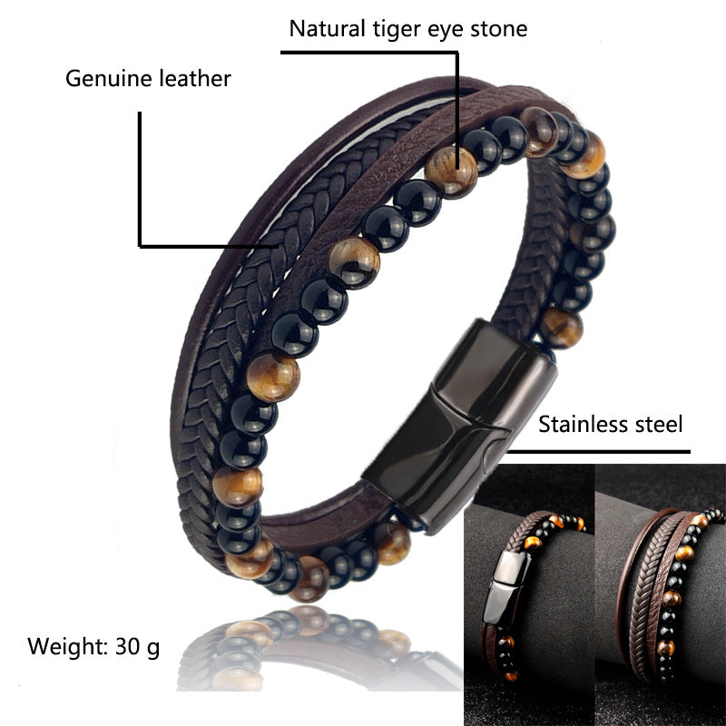 Men's Bead Leather Bracelet Tiger Eye Woven Leather Bead Bracelet
