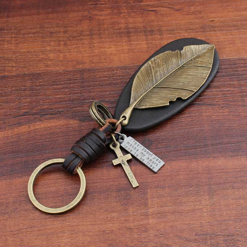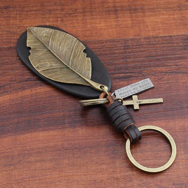 Pure Handmade Cowhide Leaf Keychain Retro Creative