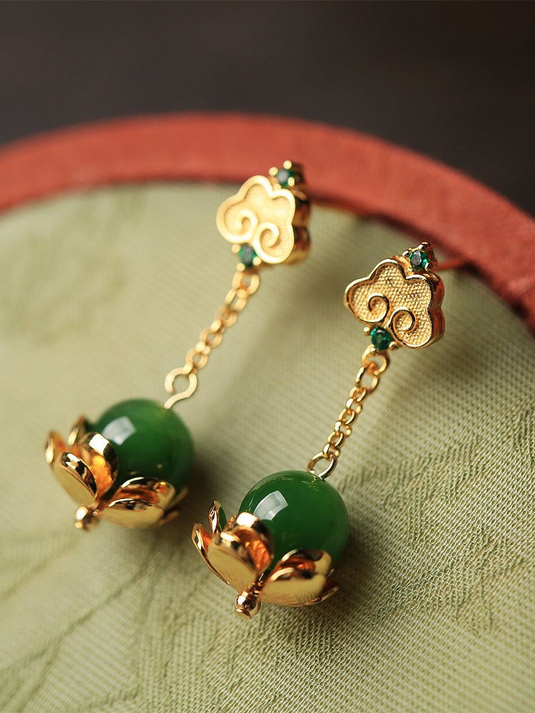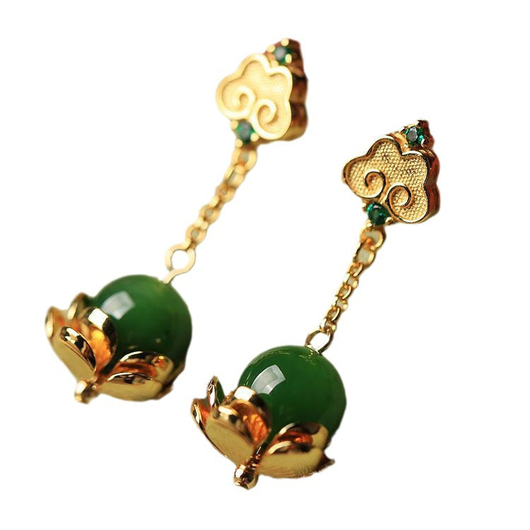S925 Silver Ancient Style Golden Wishes Hetian Jade Green Jade Earrings