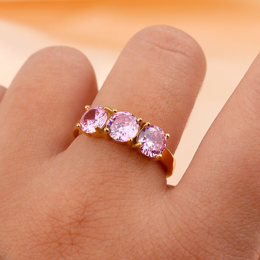 High-Grade Four-Claw Inlaid Three-Arrangement Round Zircon Titanium Steel Plated Ring