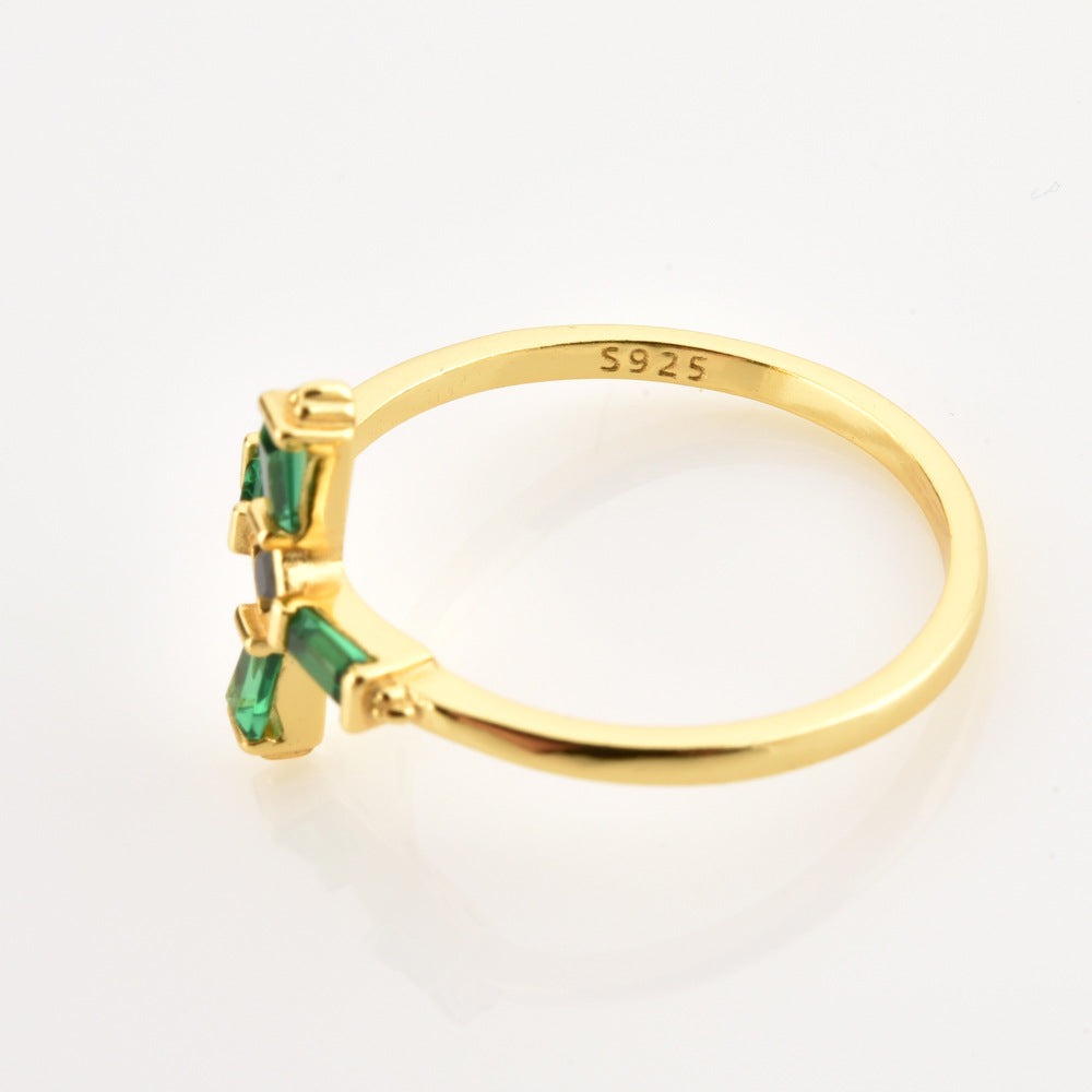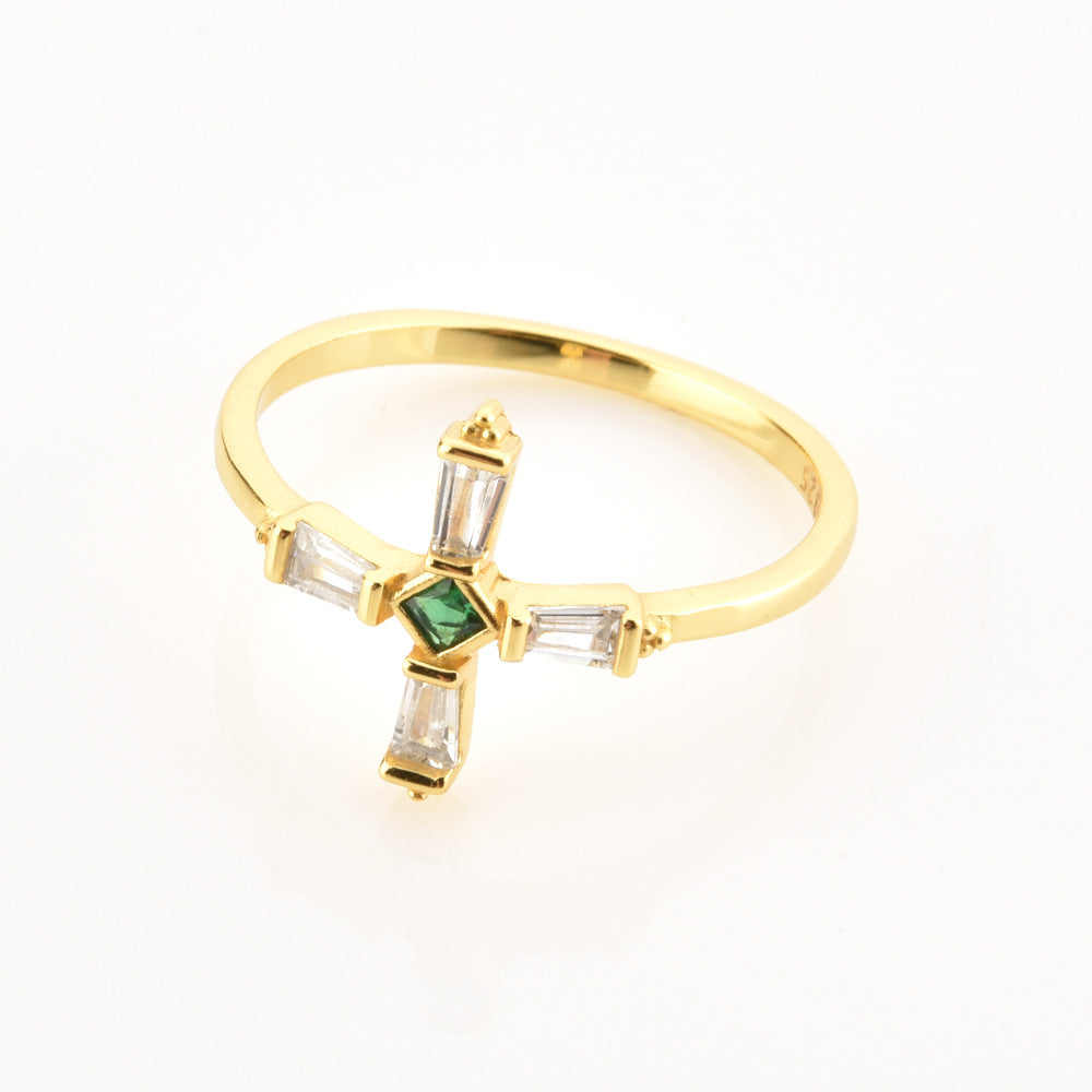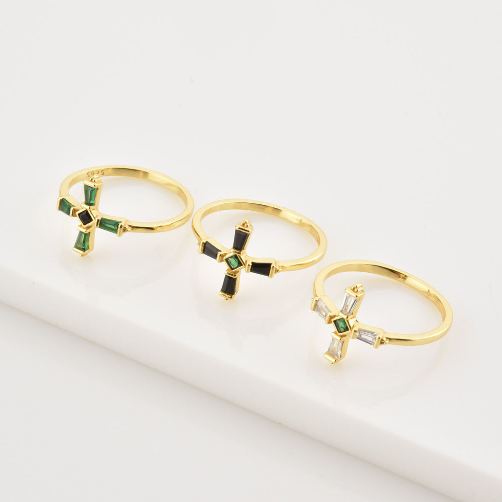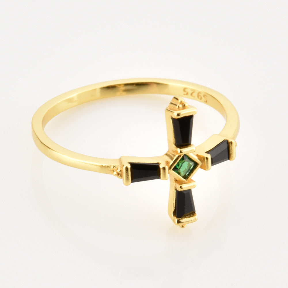 S925 Sterling Silver European And American White Stone T-Shaped Black And Green Cross Ring
