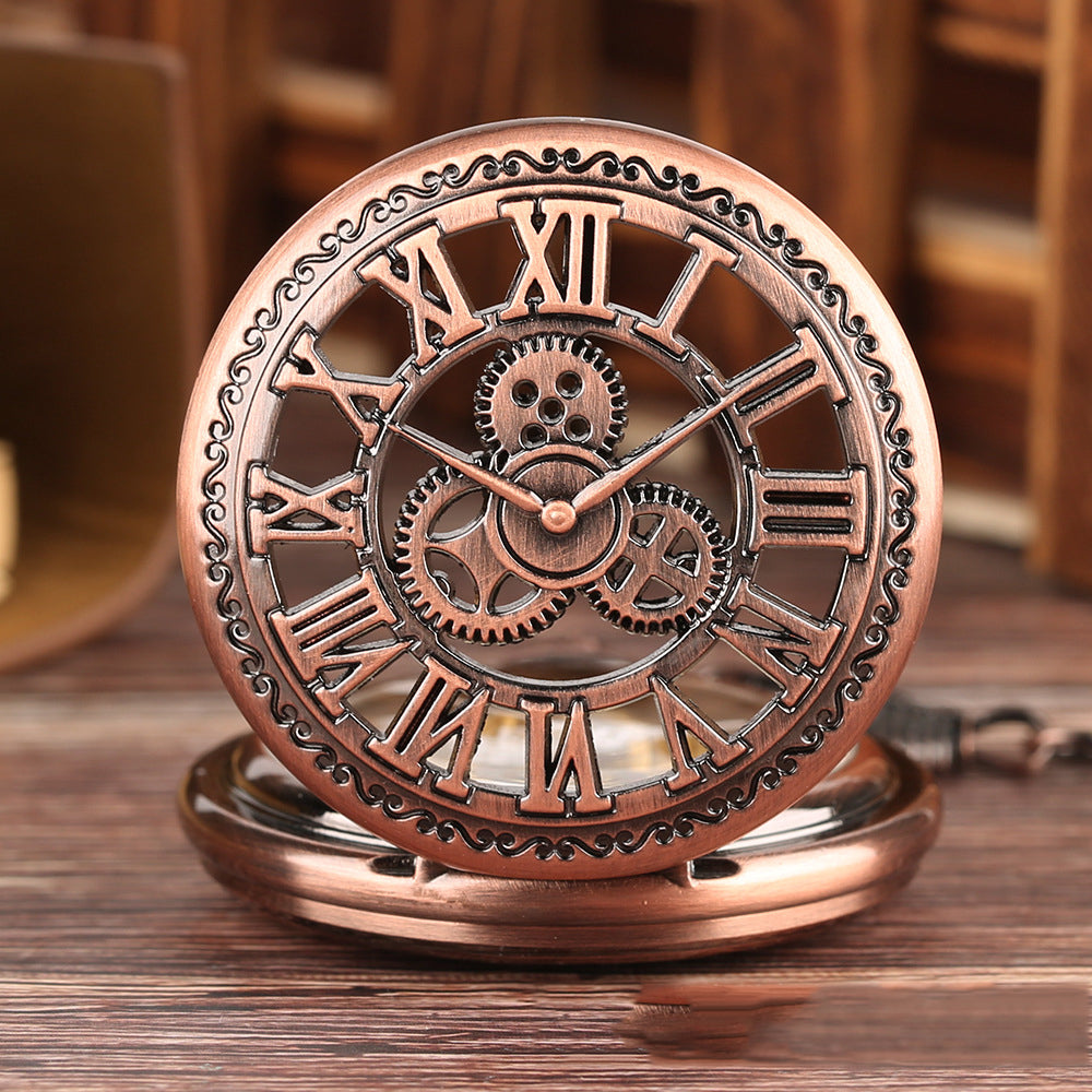 Hot Retro Flip Hollow Necklace Pocket Watch Red Copper Hollow Gear Roman Face
